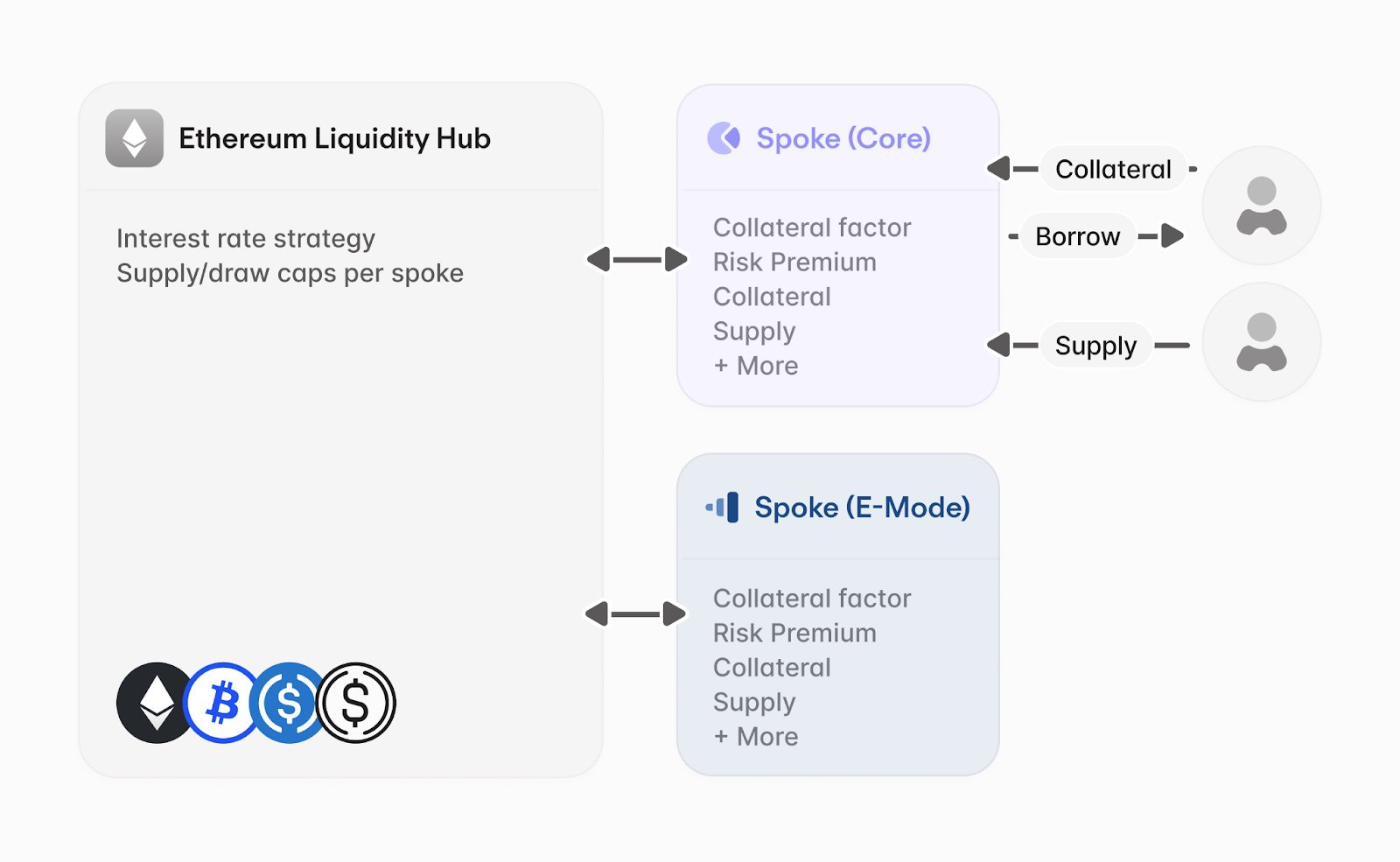 Because all Markets (Spokes) draw from the same underlying liquidity, this means that the same assets are now available across multiple markets, allowing for more competitive rates. So, the users do not interact with the Hubs, they supply and borrow directly from Markets (Spokes) of their choice, according to their specific parameters (asset type, collateral factor, supply and borrow caps, liquidation factor).