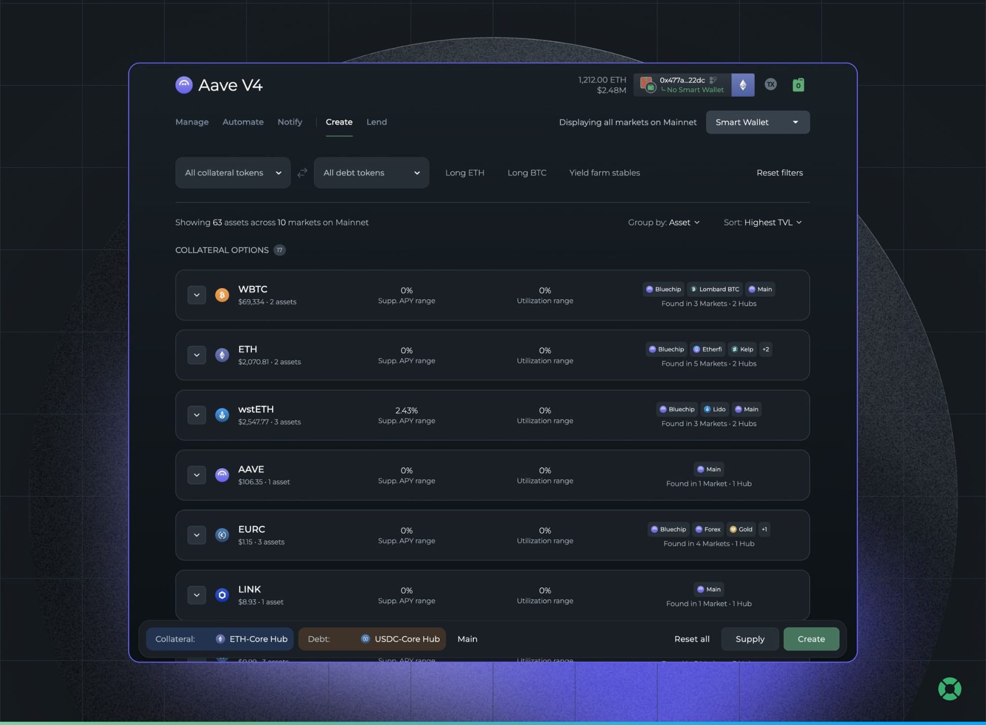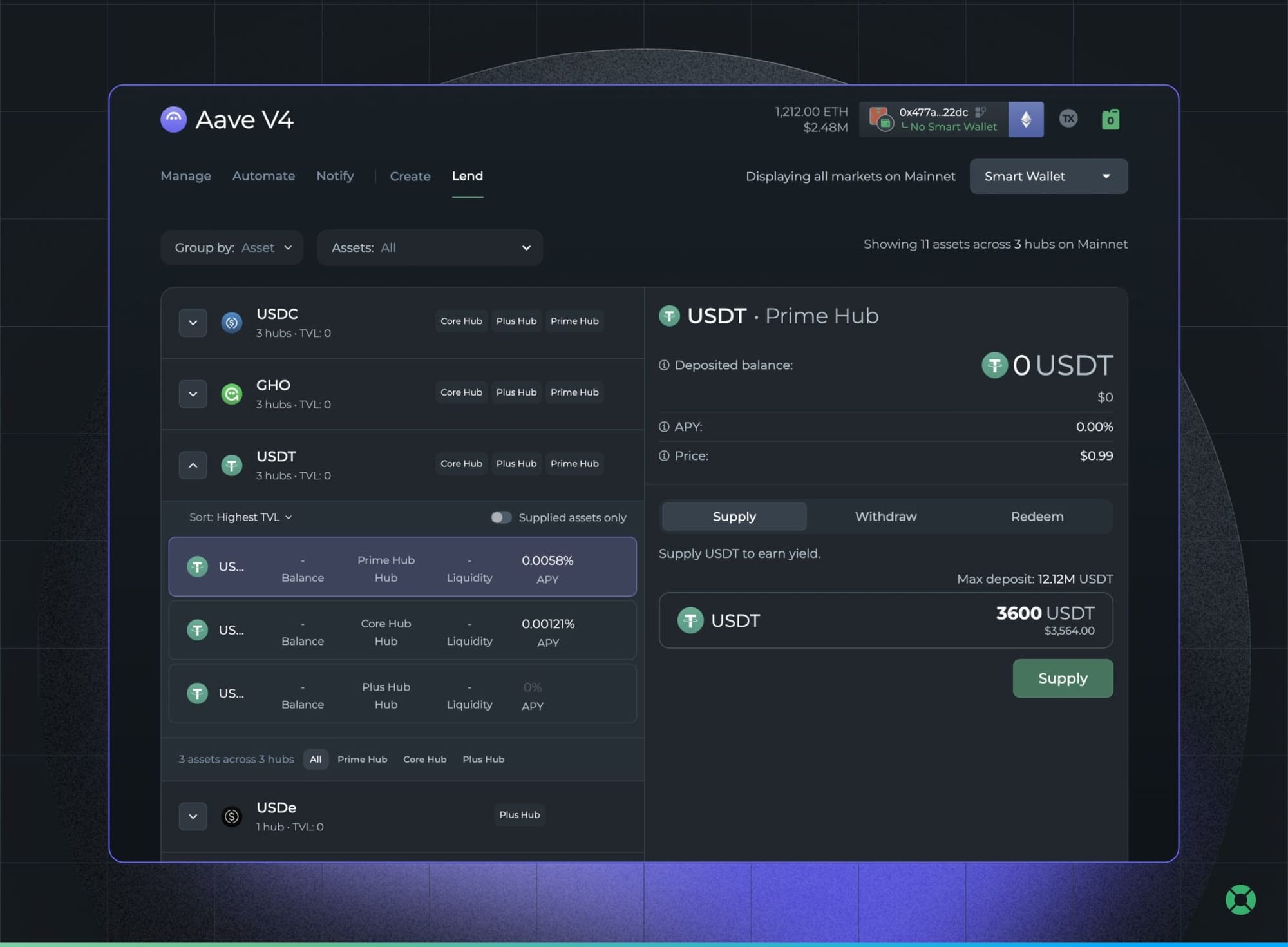 - Lend assets and earn yield by supplying liquidity to the Hub;