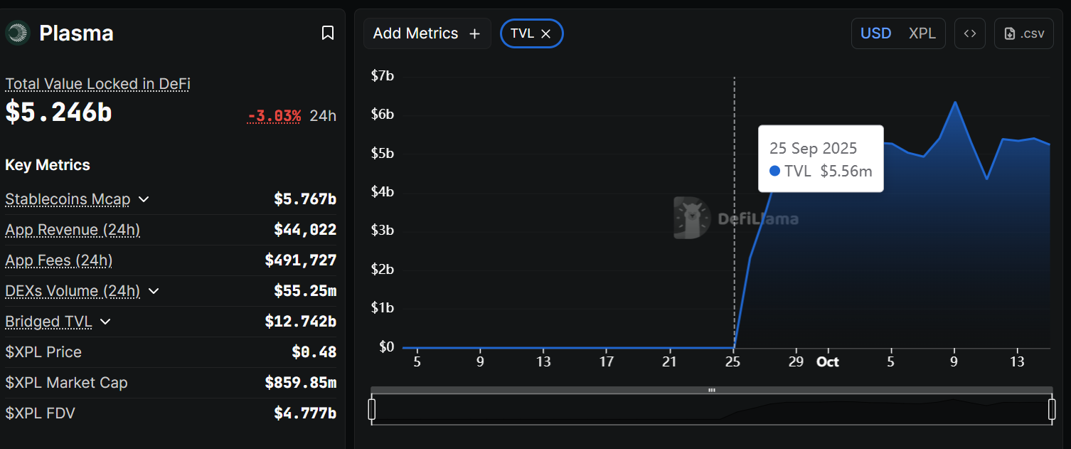 Plasma is a newly launched L1 blockchain purpose-built for stablecoins, offering full EVM compatibility, low-cost, and high-throughput transactions. At launch, the Plasma team committed to a starting stablecoin reserve of $2B, though the TVL soared to $5.56M on day one. Less than a month later, Plasma now reports a TVL of $5.246B and is the 5th largest chain by stablecoin liquidity and DeFi TVL.