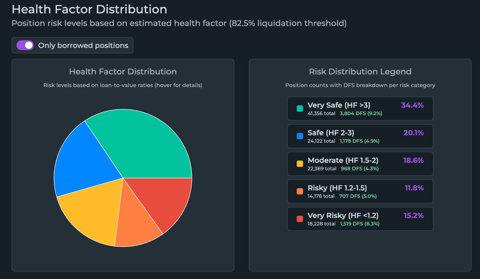 As far as our Aave metrics go, Aave’s total TVL is currently around $30.9 billion, and DFS users make up for $979.75 million. In terms of Health Factor Distribution, 34.4% of all Aave positions made by DFS users have an HF>3, considered very safe. Lastly, the top 3 most common debt/collateral pairs used in Aave are: WETH/weETH, WETH/USDT, and wstETH/USDT.