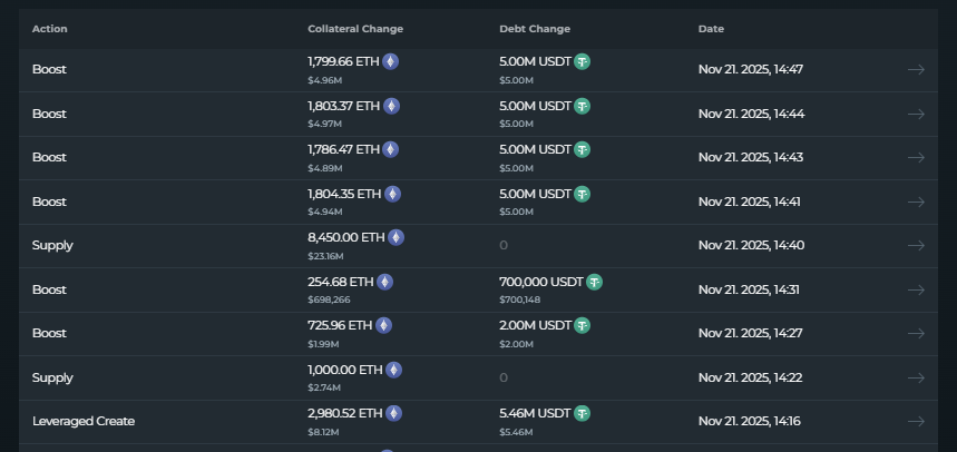 In just one day, they executed Boost twice, supplied more ETH, and then did a quadruple Boost once again. So the initial position on 21 November ended at around 19.604 ETH as collateral, and a $23.16M USDT debt.