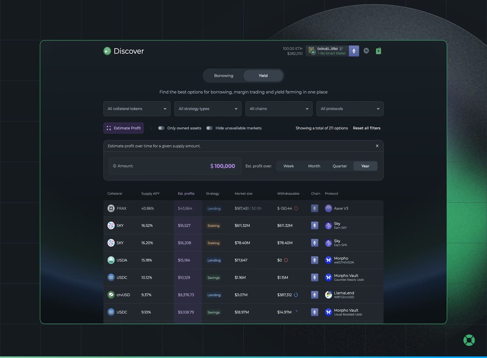 You can adjust filters by asset and strategy type, protocol, and chain, and even simulate potential profits for any supply amount over the chosen period of time. And of course, no wallet connection needed. All through a single interface.