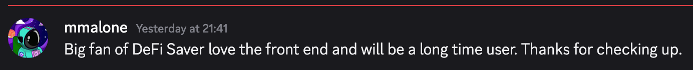 Despite this being a legitimate concern, Discord has always been DeFi Saver's primary hub for community and support-related topics. We’ve already taken all possible measures to fend off bots, but still keep in mind our team will never DM you first, or ask for any compromising information.