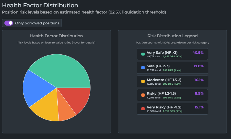 - In terms of Health Factor Distribution, 40.9% percent of all Aave positions made by DFS users have a HF>3, considered very safe.