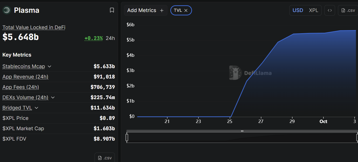 Plasma, however, is an L1 network launched on 25 September this year. Its appeal lies in low-to-no fees for stablecoin transactions, EVM compatibility, as well as its impressive liquidity from day one, with a current TVL of $5.64B.